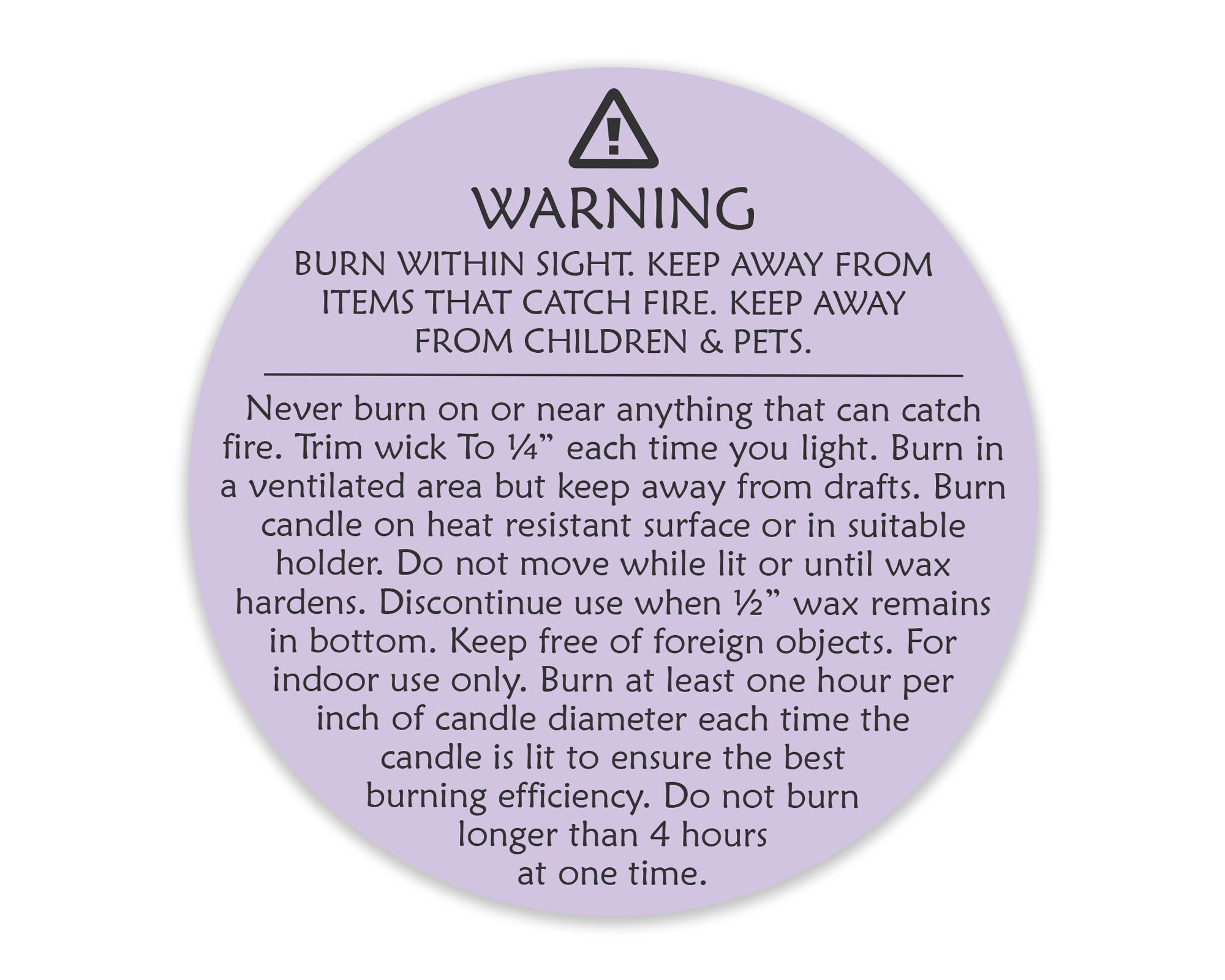 Warning Labels for Candles | Natures Garden Candle Supplies Warning Labels for Candles- 100 Count. Warning label size: 1.25 inch diameter. Warning Label Reads: Caution: Failure to follow instructions could result in fire hazard, injury, or smoke damage. Keep wax free of matches, wick trimmings, or other flammable materials. Keep wick centered & trimmed to 1/4 in. to prevent smoking & soot build up on ...
