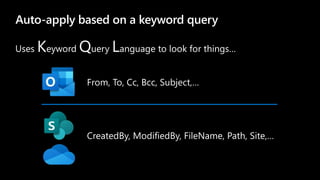 Auto Apply Retention Labels in Office 365 Using Content Types and ... Retention labels can be auto-applied based on 3 conditions: sensitive information types (both out-of-the-box and custom) keywords, content types and metadata, This post describes the third option above to demonstrate the auto-apply behavior across several column data types and content types in SharePoint.