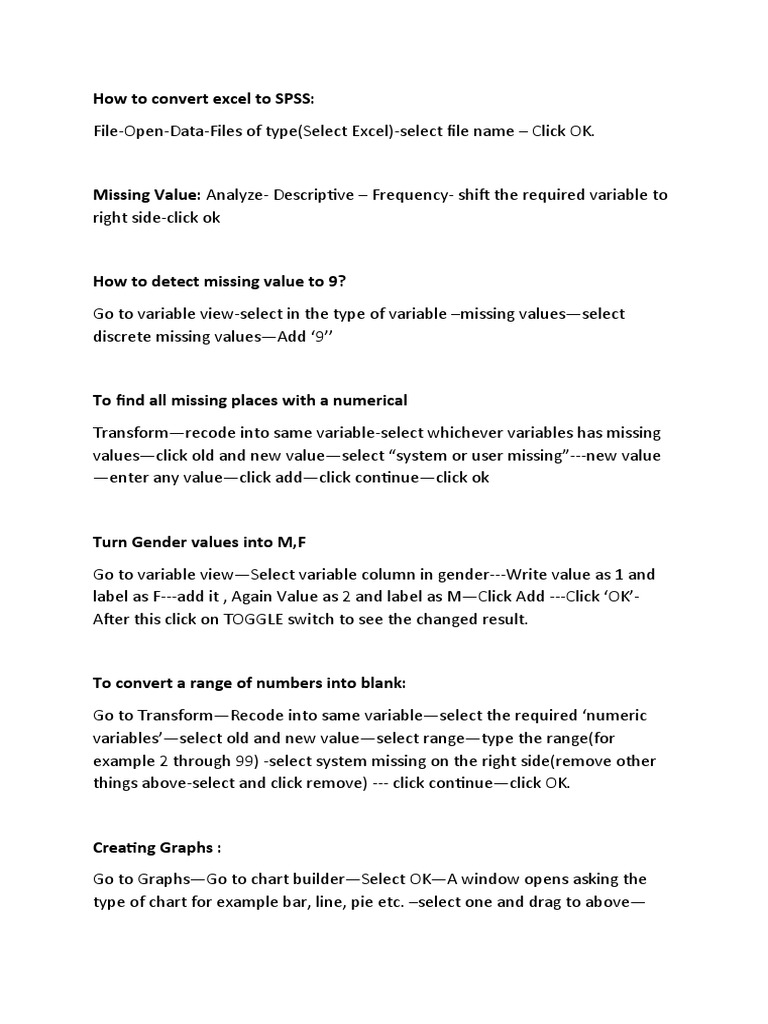libguides.library.kent.edu › SPSS › DefineVariablesSPSS Tutorials: Defining Variables - Kent State University Nov 03, 2022 · Written and illustrated tutorials for the statistical software SPSS. Variable definitions include a variable's name, type, label, formatting, role, and other attributes. This tutorial shows how to define variable properties in SPSS, especially custom missing values and value labels for categorical variables.